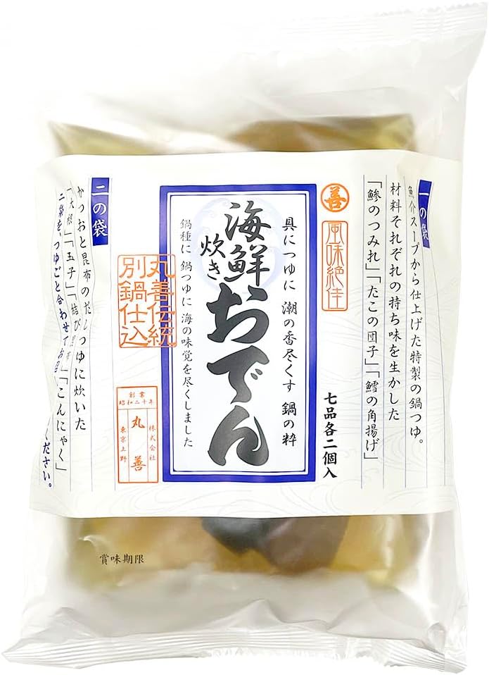 鶏ガラベースの出汁で、卵、ちくわ、つみれなど7種類14個の具材を煮込んだ大容量パックです。